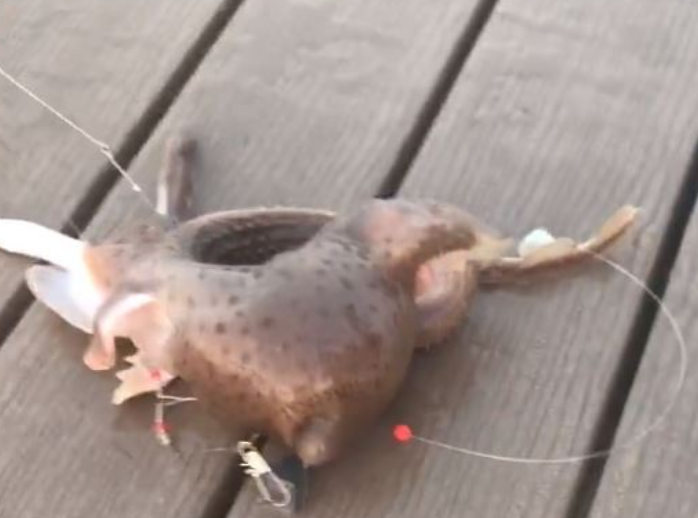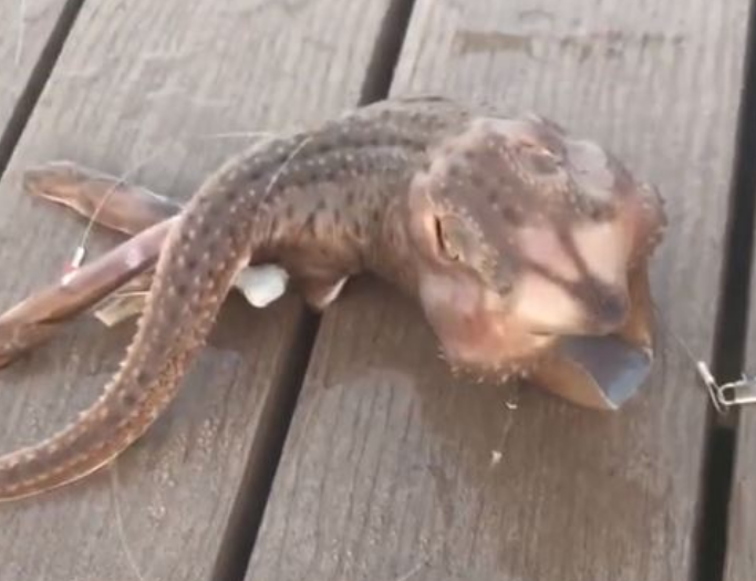 The video showed the activities of the creature as it was flopping on a decking. The creature had a long tentacle and two small appendages.