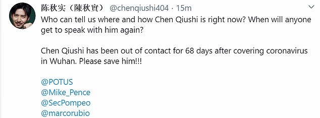“Who can tell us where and how Chen Qiushi is right now? When will anyone get to speak with him again? Chen Qiushi has been out of contact for 68 days after covering coronavirus in Wuhan. Please save him!!!” his friend posted on Twitter.