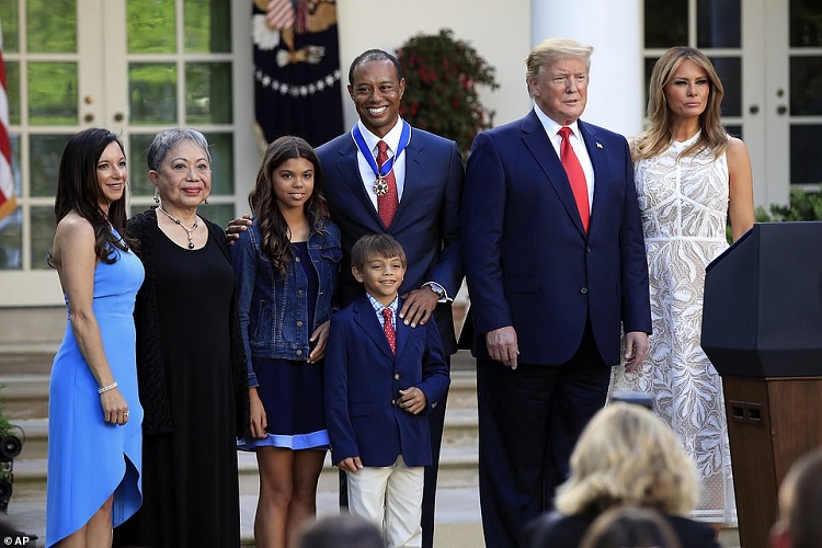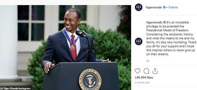 The president continued: “He’s also a great person. He’s a great guy. He inspired millions of young Americans with his thrilling wire-to-wire victories. Tiger Woods is a global symbol of American excellence, devotion, and drive.”