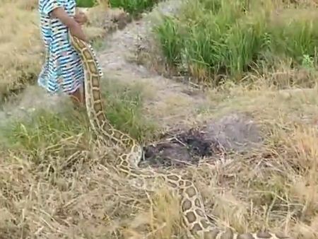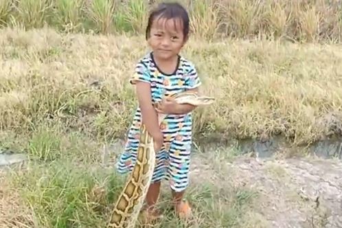 In a video that is going viral, the 3 years old Maharani can be seen playing with a huge, 5-meter long python and she seems not at all scared.