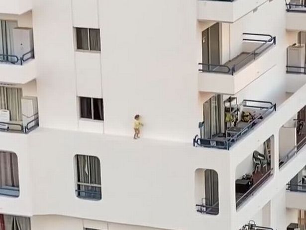 A terrifying video footage has emerged that shows a toddler climbing out of a fifth floor window and walking on the ledge of an apartment block in Tenerife.