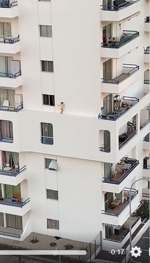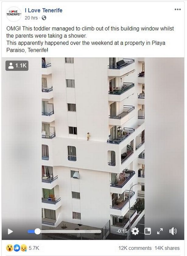 The video was posted with the caption: “OMG! This toddler managed to climb out of this building window whilst the parents were taking a shower. This apparently happened over the weekend at a property in Playa Paraiso, Tenerife!.”