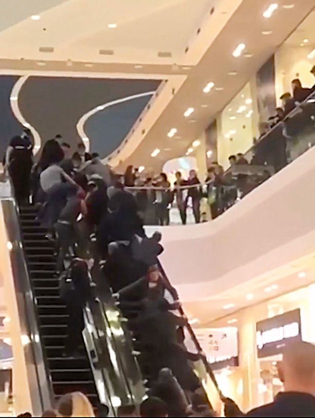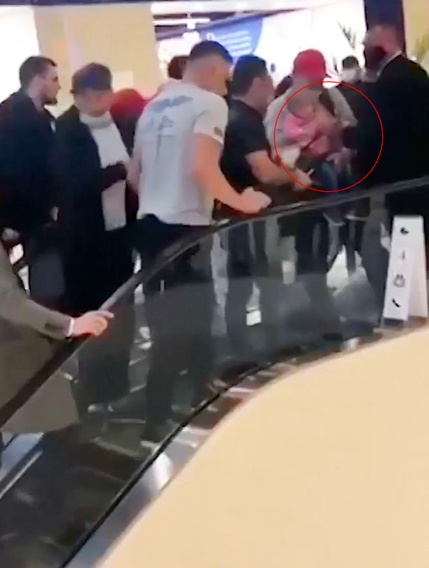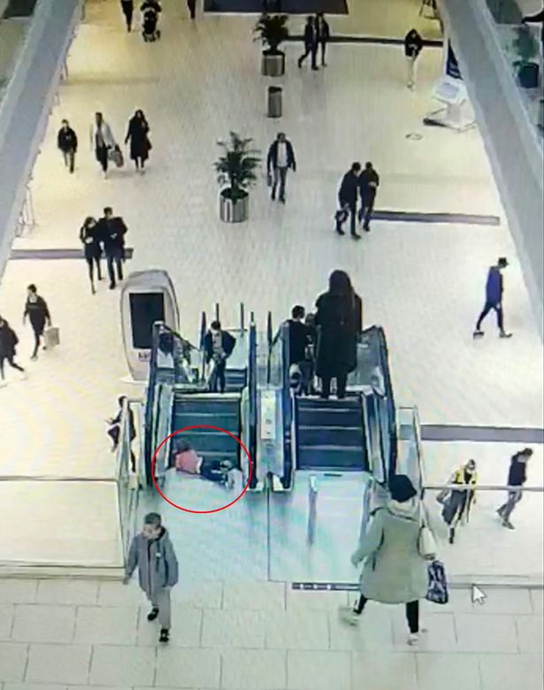 Dozens of shoppers jumped on the escalator in an attempt to stop it from moving and rescue the frightened toddler.