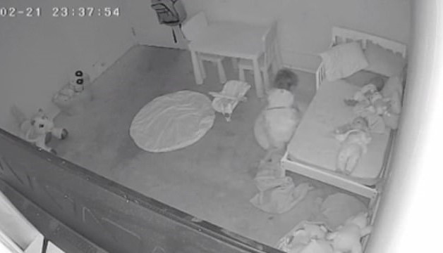 The bone-chilling incident, which was captured at 11:37 pm on February 21, shows the toddler named Emma looking under the bed.