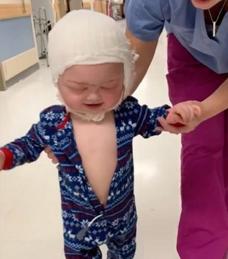 A mother managed to take a video of her infant son singing and dancing just 24 hours after he had undergone skull reconstructive surgery to save his life.