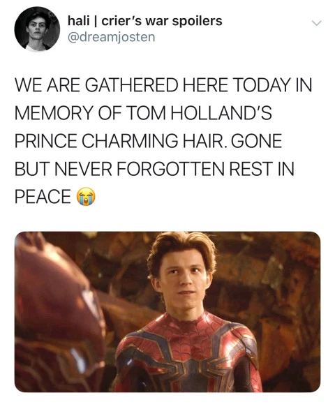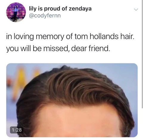 “WE ARE GATHERED HERE TODAY IN MEMORY OF TOM HOLLAND’S PRINCE CHARMING HAIR. GONE BUT NEVER FORGOTTEN REST IN PEACE,” one person said.