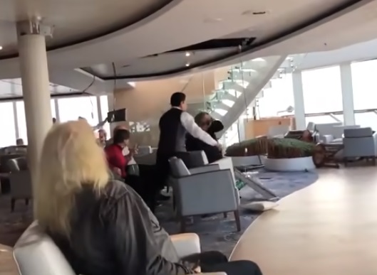 In footage shared by passengers, the giant ship is seen getting thrown around by the waves with furniture rolling across the floor and slamming into the passengers.