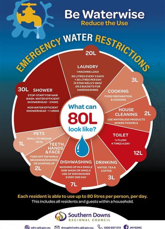 Stanthorpe is now completely dependent on around 40 truckloads of H2O a day delivered from a dam. The local dam for the town with 5,000 people has reduced to 11 percent of capacity, with Stanthorpe residents limited to 80 liters of water per person a day.
