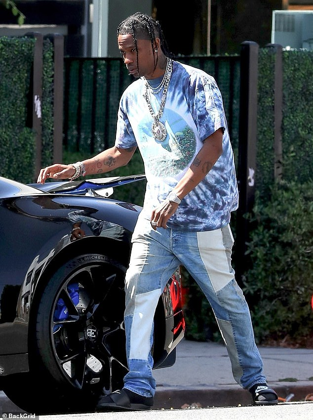 The Astroworld star was seen in a blue tie-dyed t-shirt that had a skeleton drawn on a bed of flowers as he stepped out of his new million-dollar car.