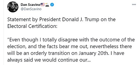 “Even though I totally disagree with the outcome of the election, and the facts bear me out, nevertheless there will be an orderly transition on January 20,” he said in a statement.
