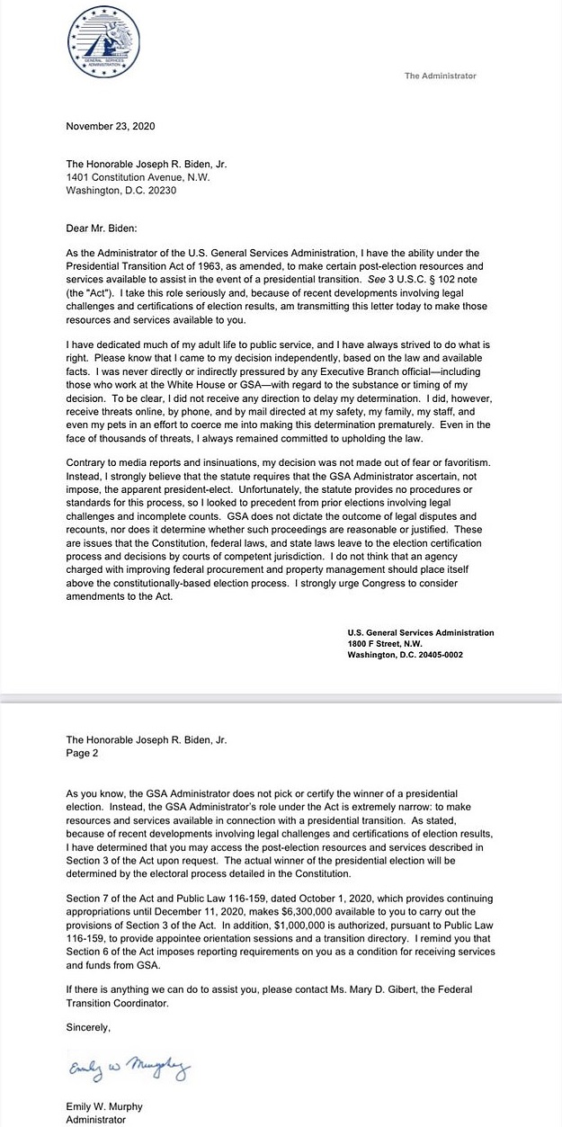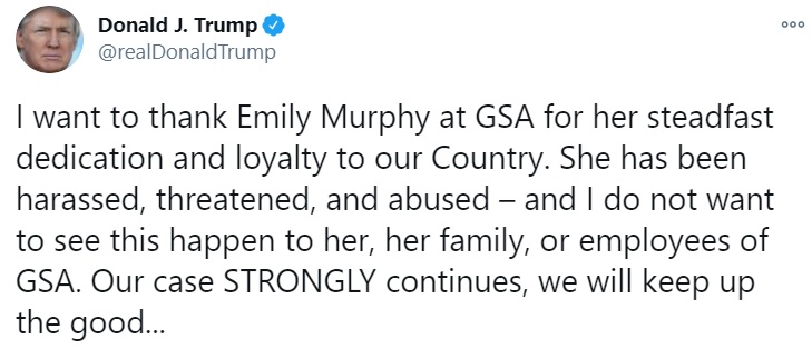 “I want to thank Emily Murphy at GSA for her steadfast dedication and loyalty to our Country. She has been harassed, threatened, and abused – and I do not want to see this happen to her, her family, or employees of GSA. Our case STRONGLY continues,” Trump tweeted moments after the letter was sent to Joe Biden.