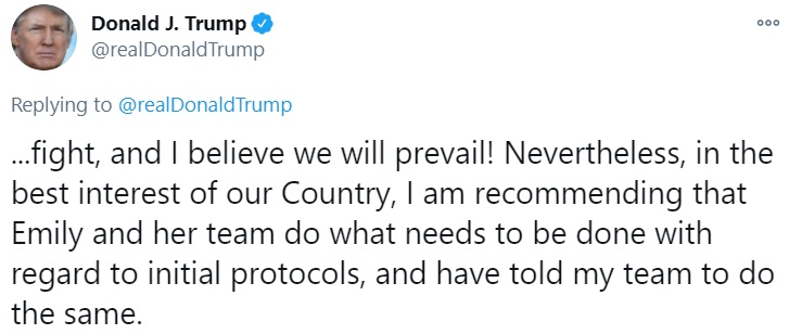 “We will keep up the good fight, and I believe we will prevail! Nevertheless, in the best interest of our Country, I am recommending that Emily and her team do what needs to be done with regard to initial protocols, and have told my team to do the same.”