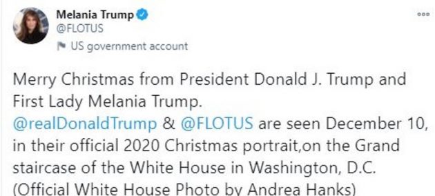 The first lady shared the photo on Twitter, writing: “Merry Christmas from President Donald J. Trump and First Lady Melania Trump.”