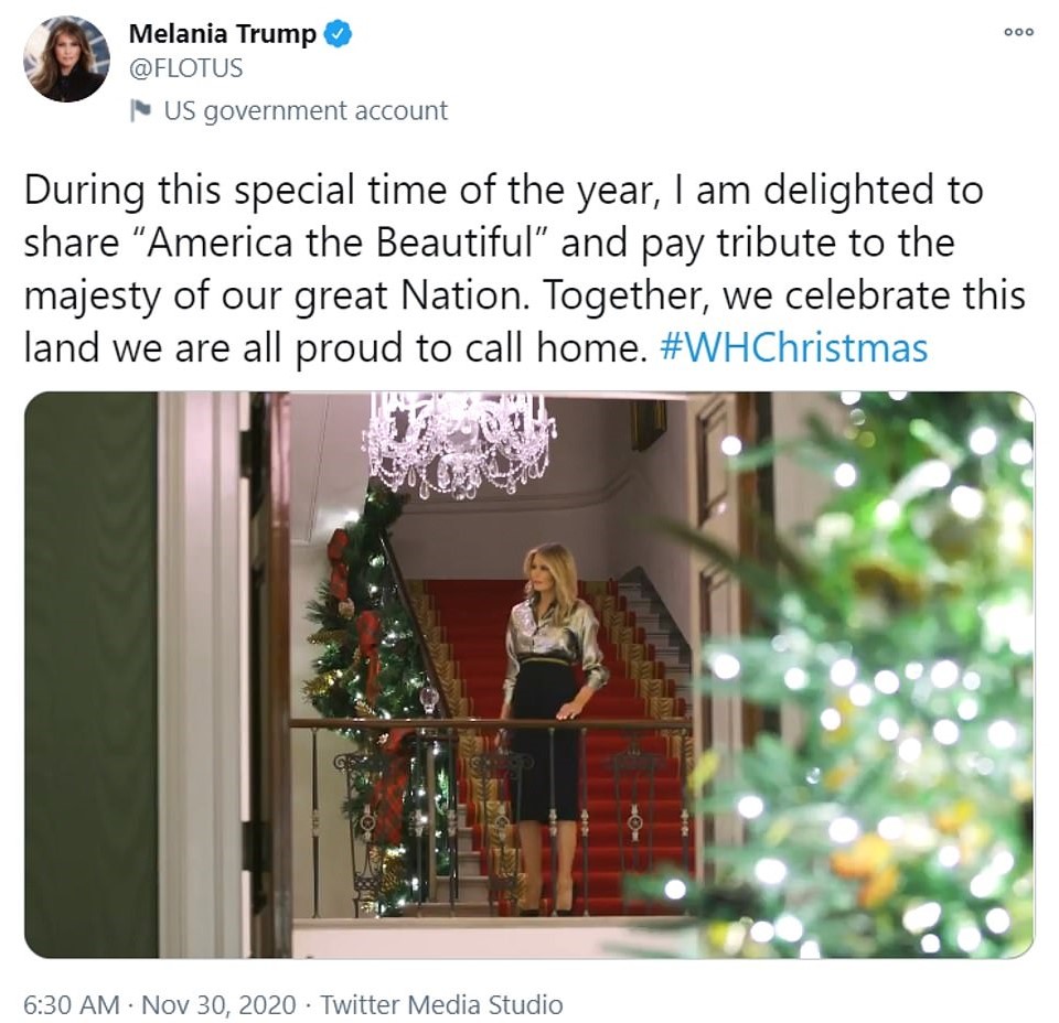 Melania wrote on Twitter: “During this special time of the year, I am delighted to share “America the Beautiful” and pay tribute to the majesty of our great Nation. Together, we celebrate this land we are all proud to call home.”