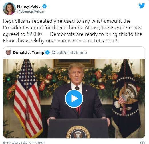 “At last, the President has agreed to $2,000 – Democrats are ready to bring this to the Floor this week by unanimous consent. Let’s do it!”
