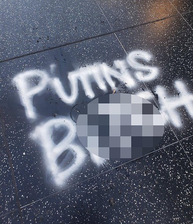 The incident on Hollywood Boulevard occurred at around 3:40 am when the offenders sprayed the star black and wrote “Putin’s bit*h” across it in white color.