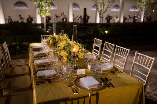”The table linens featured ombré shades of yellows and greens and the centerpieces consisted of golden wattles and more than 2,500 California roses in shades of yellow. The tables, illuminated with gold oil lamps, also had golden Champagne grapes to highlight both countries’ rich wine industries.”