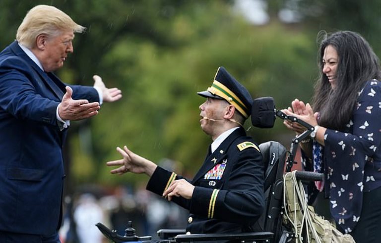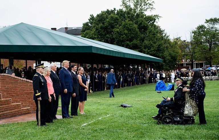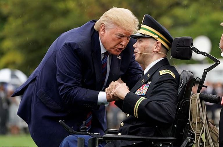 President Donald Trump hugged a wheel-chair bound and wounded Afghanistan hero who sang ‘God Bless America’ at a tribute ceremony to honor the new incoming chairman of the Joint Chiefs of Staff.