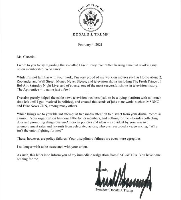 Trump has officially quit the Screen Actors Guild in a snarky letter he sent to the association after they threatened to kick him out over the January 6 insurrection.