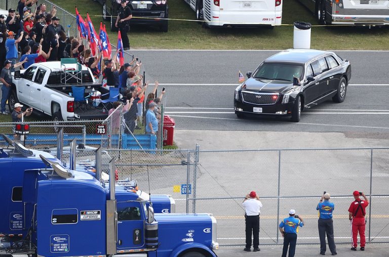Trump came in a low Air Force One flyover of the Daytona International Speedway and brought his campaign to the race as he took a lap around the race track in the presidential limousine ‘The Beast’ along with other presidential cars.