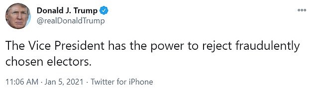 In his Tuesday tweet, the President falsely wrote that Pence, who will preside a joint session of the United States Congress during which electoral votes will be tallied, has the power to reject the votes.