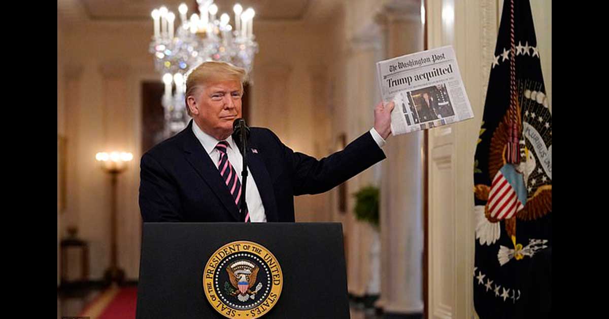 It is there when he held up a copy of the Washington Post, with the words, “Trump Acquitted” in large font, said that it was the only good headline he ever had, and even consider framing it.