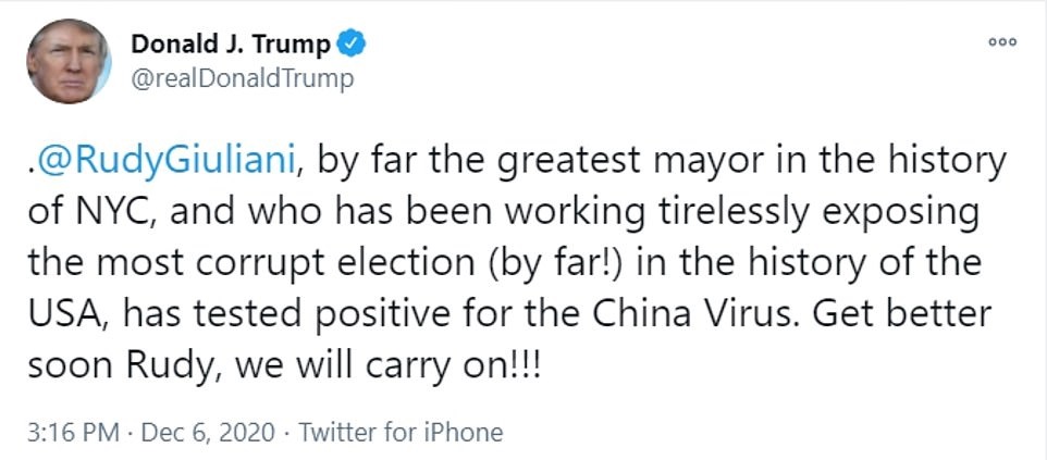 “@RudyGiuliani, by far the greatest mayor in the history of NYC, and who has been working tirelessly exposing the most corrupt election (by far!) in the history of the USA, has tested positive for the China Virus,” Trump tweeted on Sunday afternoon.