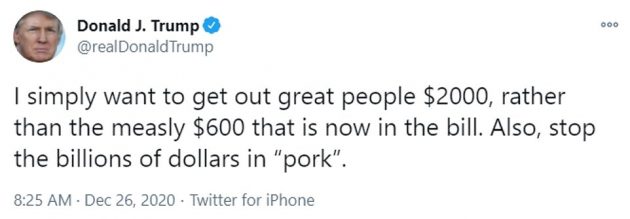 “I simply want to get our great people $2,000, rather than the measly $600 that is now in the bill,” he wrote on Twitter. “Also, stop the billions of dollars in ”pork”.”