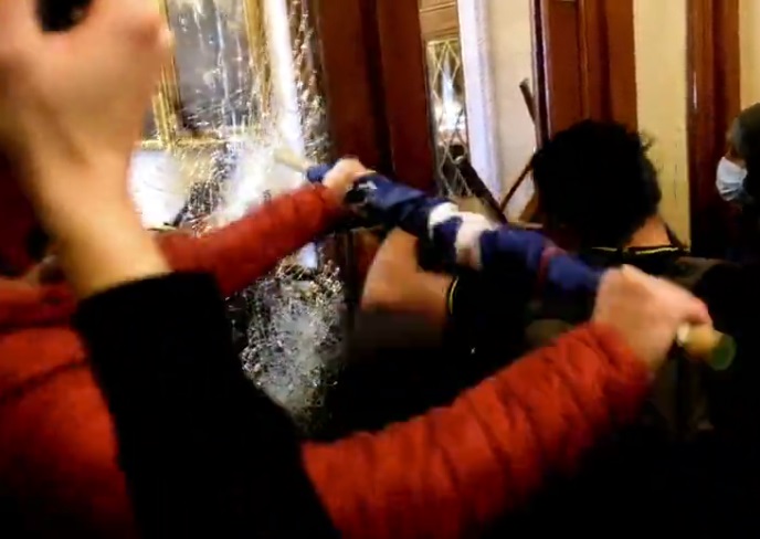 A new video suggests that the 35-year-old Trump supporter was shot while attempting to breach an area blocked off by the police by climbing through a broken window.