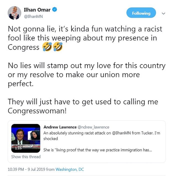 Omar brushed off Carlson’s criticism. She wrote on Twitter: “Not gonna lie, it’s kinda fun watching a racist fool like this weeping about my presence in Congress.