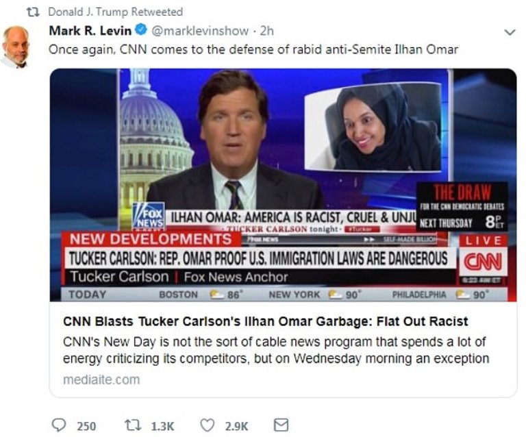 Trump then showed his support for Carlson on Twitter. He retweeted radio host Mark Levin who shared a link to a Mediate piece which described how ‘New Day’ host John Berman called Carlson’s words a ‘flat-out racist comment.’