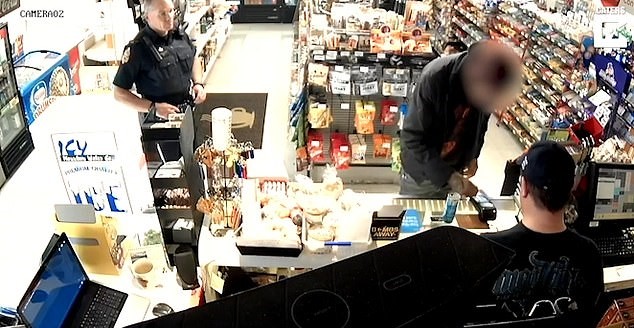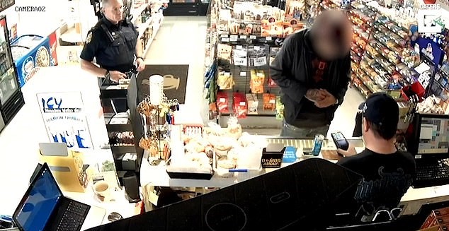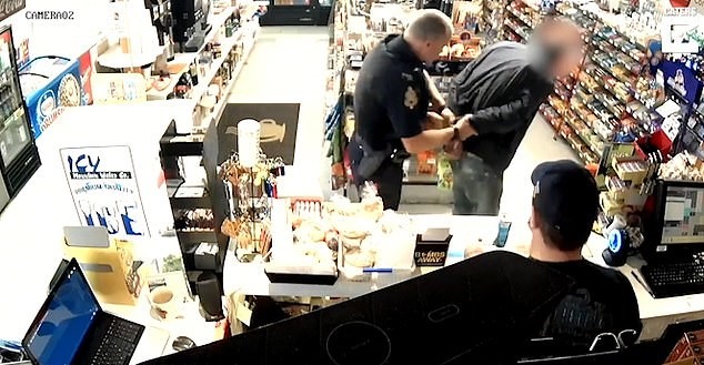 Just seconds after his card was rejected, the cop standing behind him checked the card and handcuffed the man before dragging him out of the Starlite Convenience Store.