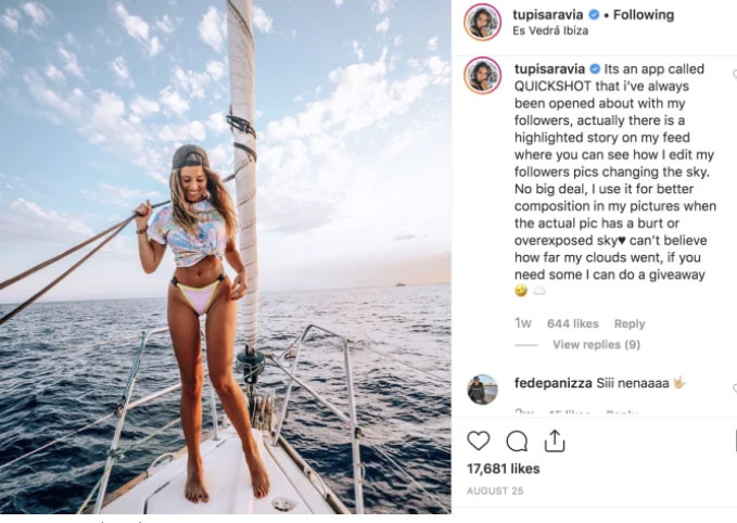 People love her pictures. Recently, she confirmed that she had been putting fake clouds into her photos after people noticed the same cloud formations in different shots. The Influencer is now teaming up with the photo editing app to create more fake cloud patterns to use.