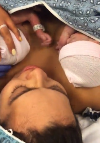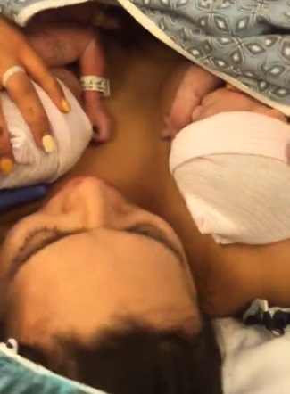 “The baby on my right laying on my chest was the weaker twin who was born two minutes later, she barely passed some of the hospital tests, such as her blood sugar and her car seat test. I thought maybe the stronger twin knew her sister needed strength.”