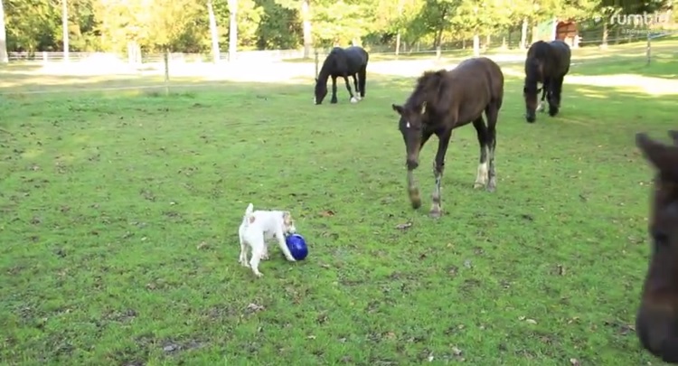 This particular video shows Frisbee minding his own business playing with a ball as the horses lounge around him. That’s when the two foals slowly make their way to Frisbee with one of them grabbing at the ball with his hoof.
