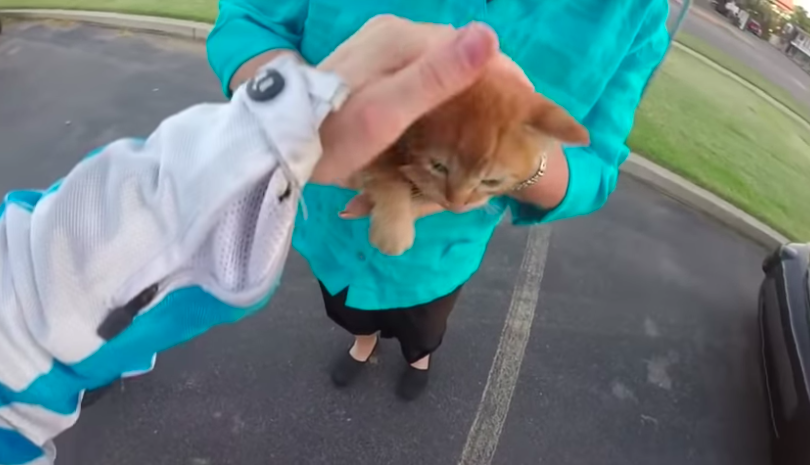 And then she immediately got on her bike and came to the other side of the road to look after the tiny creature. The driver adopted the kitten and named him “Skid.”