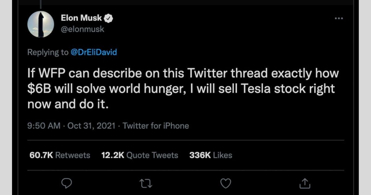 Posting on Twitter Musk responded to the request, writing: “If WFP can describe on this Twitter thread exactly how $6B will solve world hunger, I will sell Tesla stock right now and do it.”