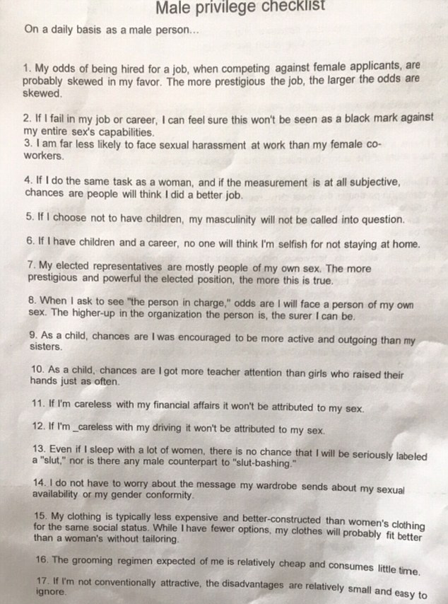 The thorough checklist presented alleged advantages that males have over females when it comes to career, personal safety, clothing, and so on.