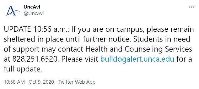 “If you are on campus, please remain sheltered in place until further notice. Students in need of support may contact Health and Counseling Services,” the update read.