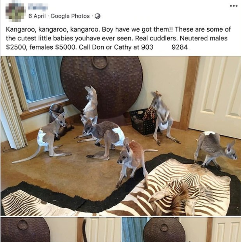 The lady posted a photo of six baby kangaroos with an asking price of AUD 2800 for males and AUD 7100 for females joeys.