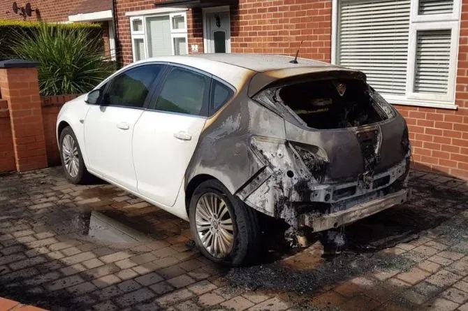 The incident occurred in Oldham, England, where 46-year-old John Lowe woke up only to realize his car was set ablaze while his family was asleep.