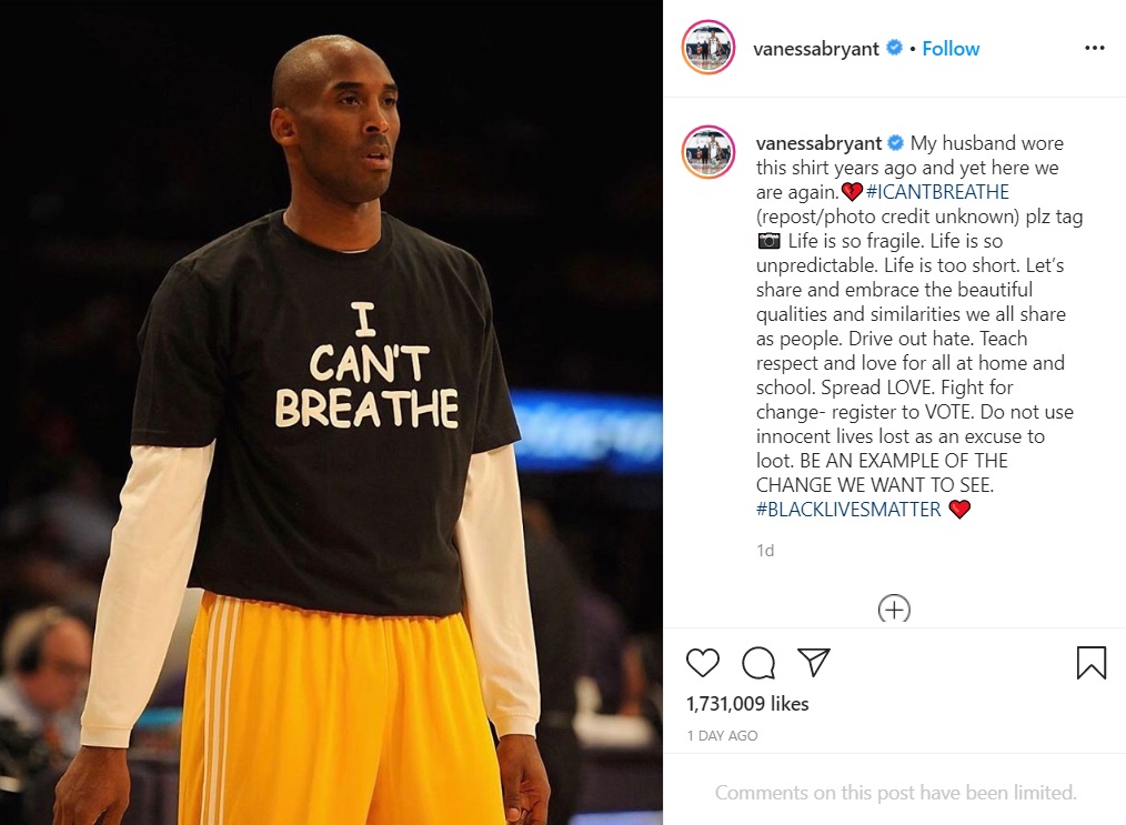 Vanessa Bryant has shared a touching photo of her late husband Kobe Bryant wearing a shirt that reads ‘I CAN’T BREATHE’ following the murder of George Floyd who was filmed crying out for help as police officer Derek Chauvin was kneeling on his neck.