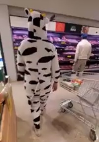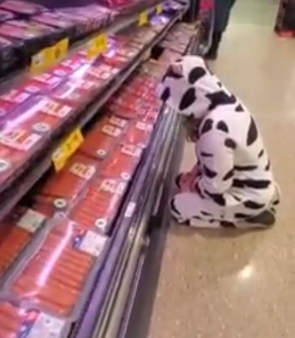 A vegan activist was caught on camera mourning at the meat section of a supermarket while dressed up as a cow.