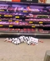 The bizarre form of demonstration which took place in Perth, Australia, was posted online by the woman’s accomplice, Stef Rose, who shared the footage on Facebook and captioned it “welcome to the death aisle.”