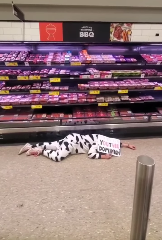 While no one in the supermarket appeared to bat an eye over the vegan’s protest, the woman was swiftly kicked out of the store for attempting to cause a commotion.