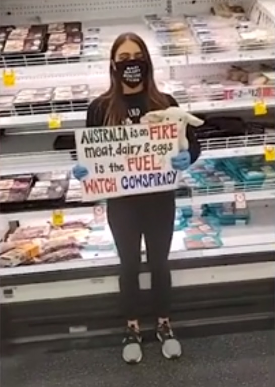 Animal activist Tash Peterson, who is a member of Direct Action Everywhere, paid a visit to multiple Woolworths and Coles outlets in Perth to call out meat-eaters for ‘fueling’ bushfires.