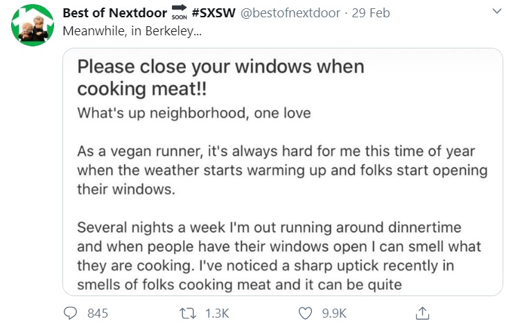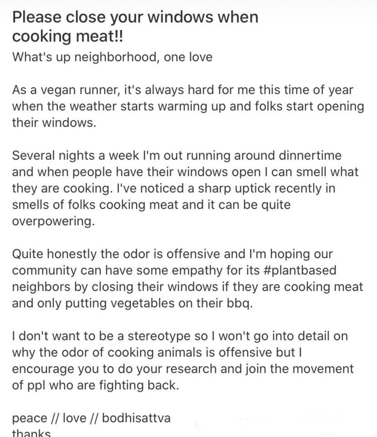 “Quite honestly the odor is offensive and I’m hoping our community can have some empathy for its #plantbased neighbors by closing their windows if they are cooking meat and only putting vegetables on their bbq.”
