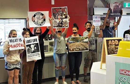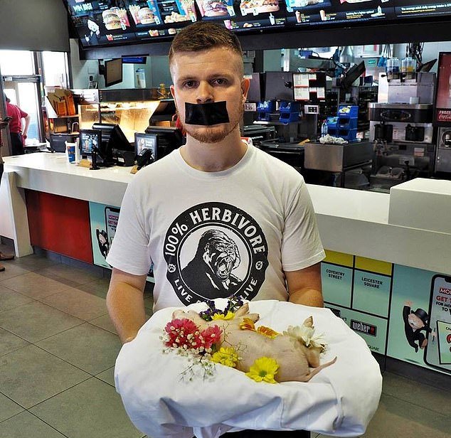 Previously, the same group marched into a McDonald’s and dropped a dead piglet on their counter. The activists, including leader James Warden, not only stole the piglet from a piggery but also petrified the customers as they took over the restaurant with graphic placards.