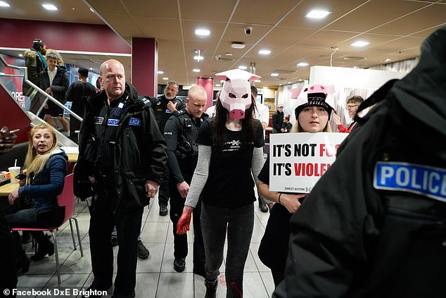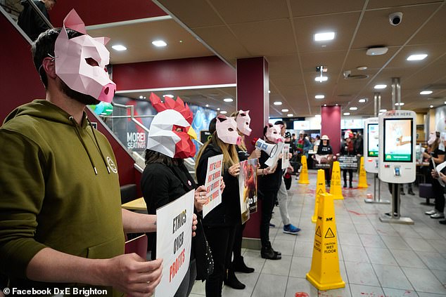 More than 20 animal rights campaigners from Direct Action Everywhere (DxE) wearing pig and chicken masks headed to a branch of McDonald’s in Brighton.