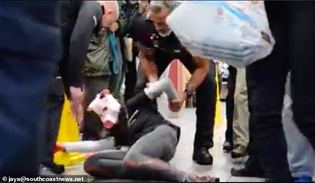The vegans chanted: ‘Dairy is Scary’ and ‘Until Every Animal is Free’ and sprayed fake blood on the floors in front of shocked customers.